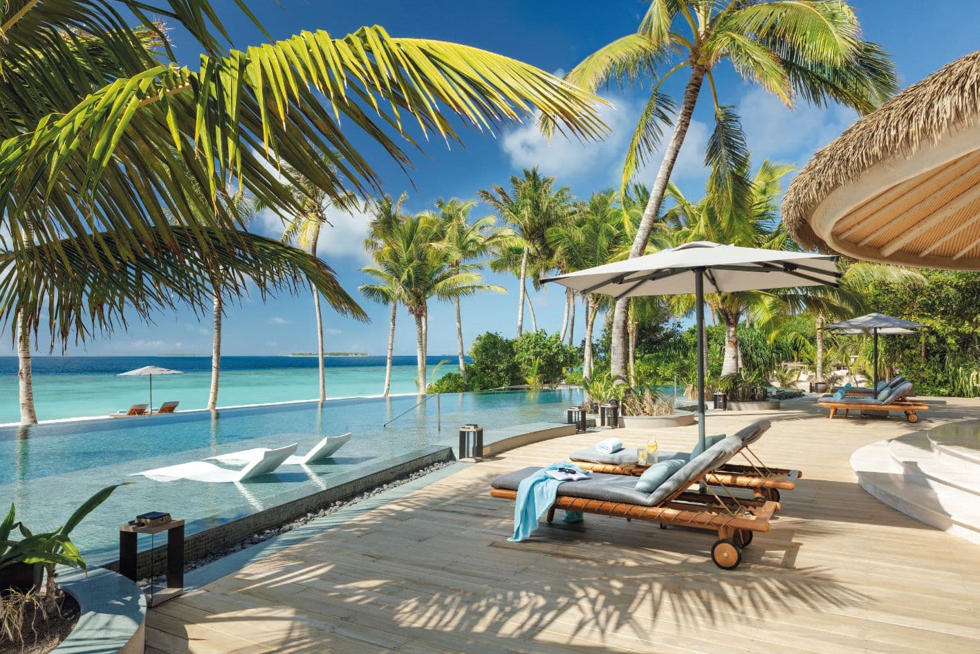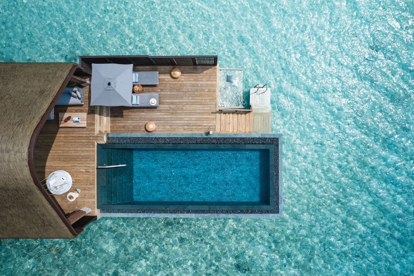 Die elegante Ocean Pool Villa verfügt neben einem traumhaften Schlafzimmer über ein geräumiges, luxuriöses Badezimmer mit Outdoor-Regendusche sowie ein separates Ankleidezimmer. Vom privaten Sonnendeck mit Over-Water-Hängematte und eigenem Infinity-Pool hat man direkten Zugang ins Türkis der Lagune und genießt einen einzigartigen Blick über den Indischen Ozean.